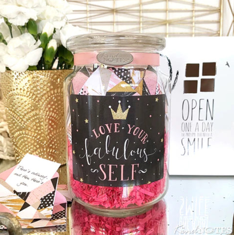 Celebrate your girlfriend’s unique and fabulous self with this Love Your Fabulous Self Jar of Notes. Hampered with a sparkly crown, this chic glass jar is a slogan for her royal personality, honorful and centered. Each note inside proves to be a sentimental words of adoration and appreciation, no doubt, tend to warm her heart, bringing a smile on her face. With its elegant design and thoughtful messages, this jar is a perfect romantic gift that captures the essence of her radiant personality.
